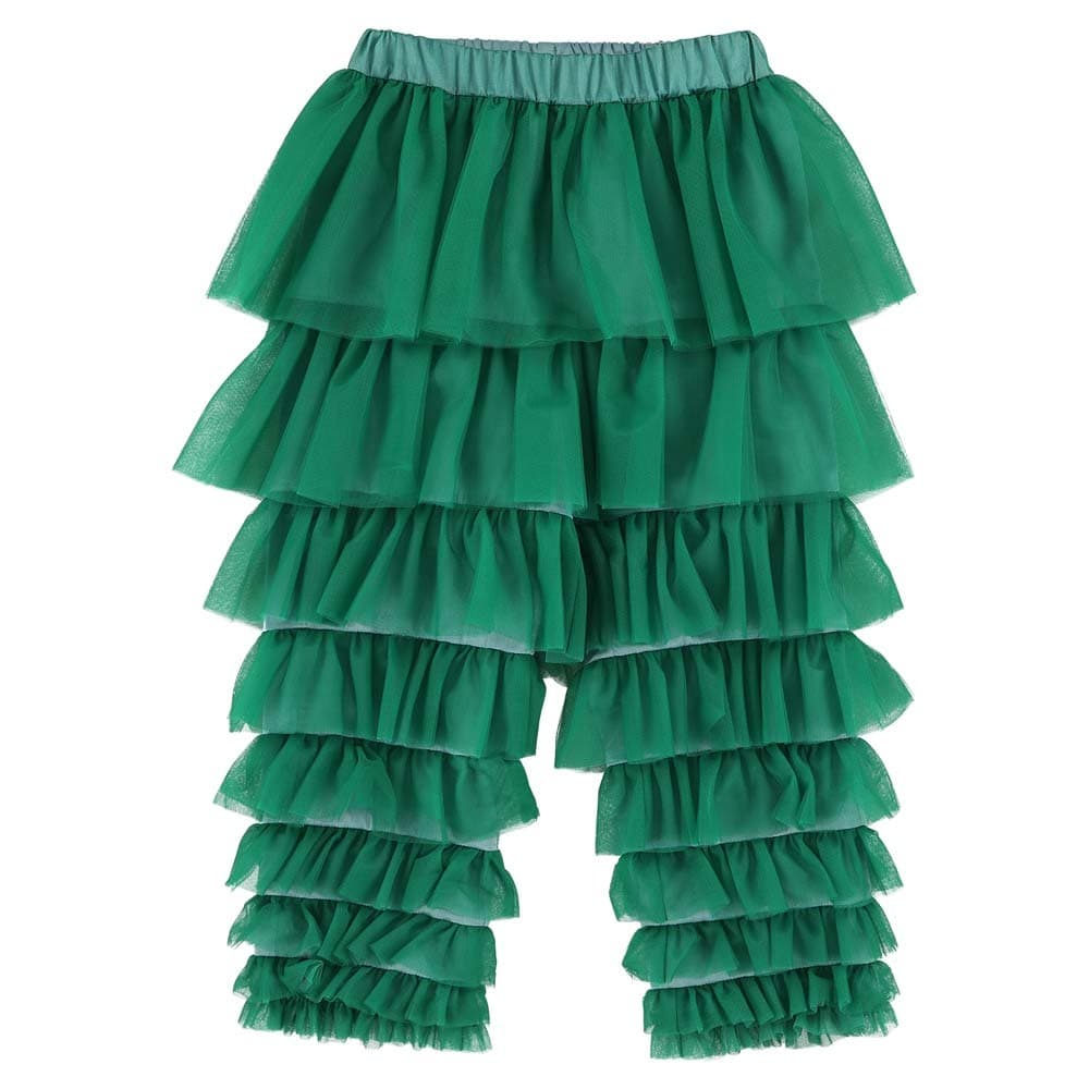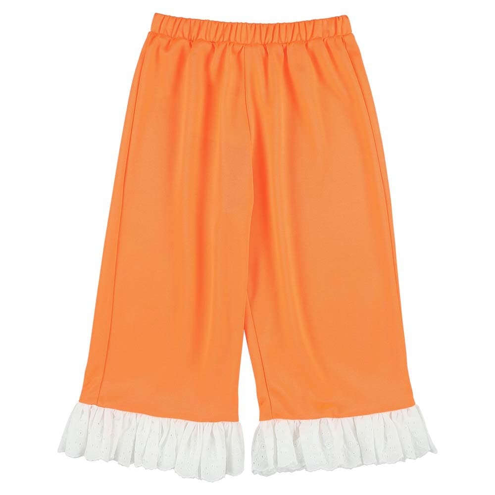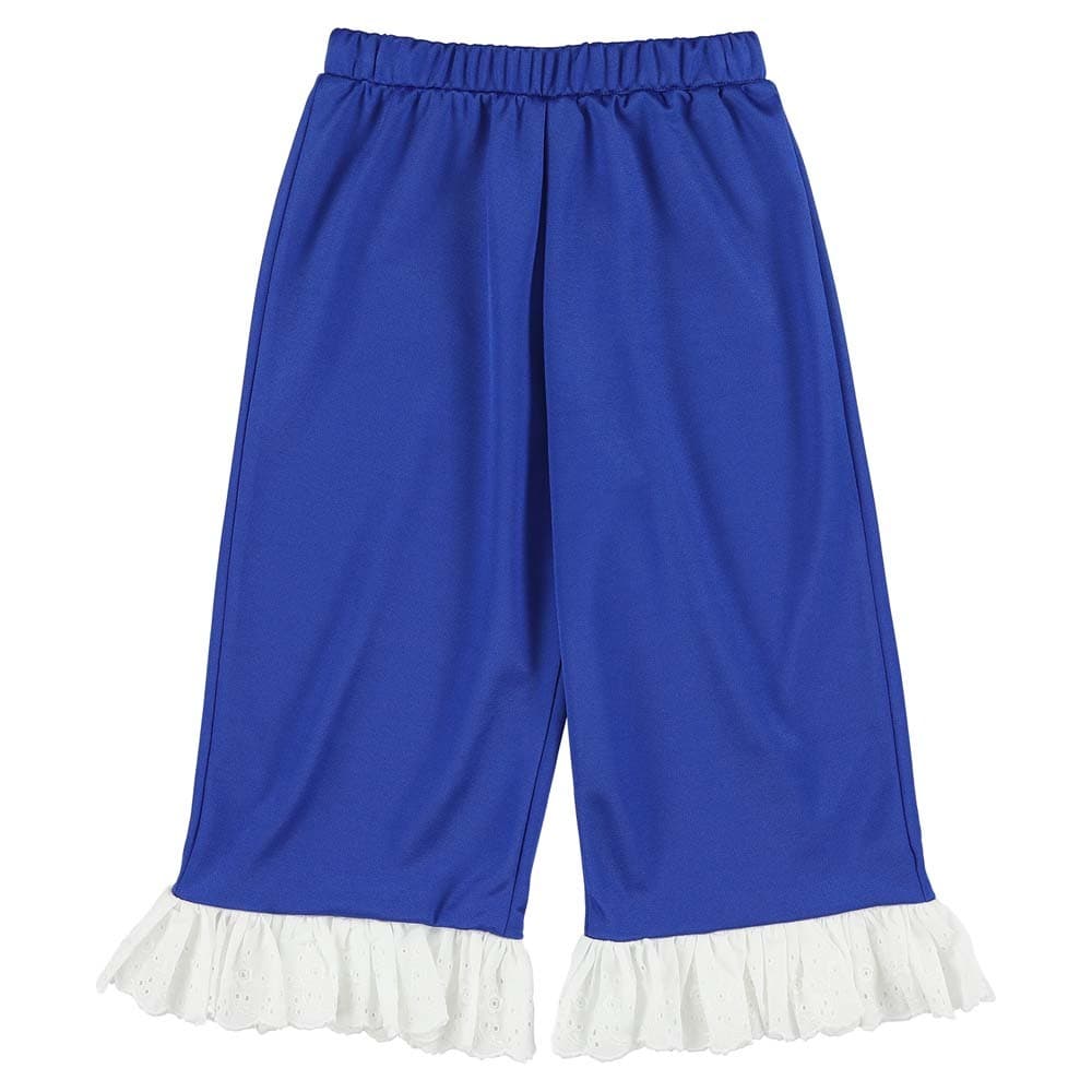 Light blue culotte pants with a playful white ruffled hem. Soft and breezy fabric for comfortable movement.